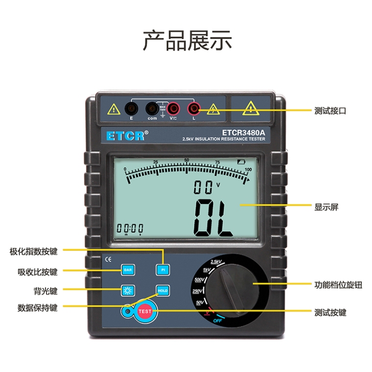 ETCR3480A绝缘电阻表又名兆欧表、绝缘电阻测试仪,用于绝缘电阻测试、吸收比、极化指数测试、交直流电压测试。仪表具有LCD大屏幕带背光显示、数据保持、自动放电、自动关机等功能。仪表具有测试计时,电压监测功能,回路电压大于36V时,仪表将禁止测试以保护被测物及人员**。仪表功能操作简易,绝缘电阻值,测试时间,输出电压同屏显示,具备交流电压、直流电压测试功能。