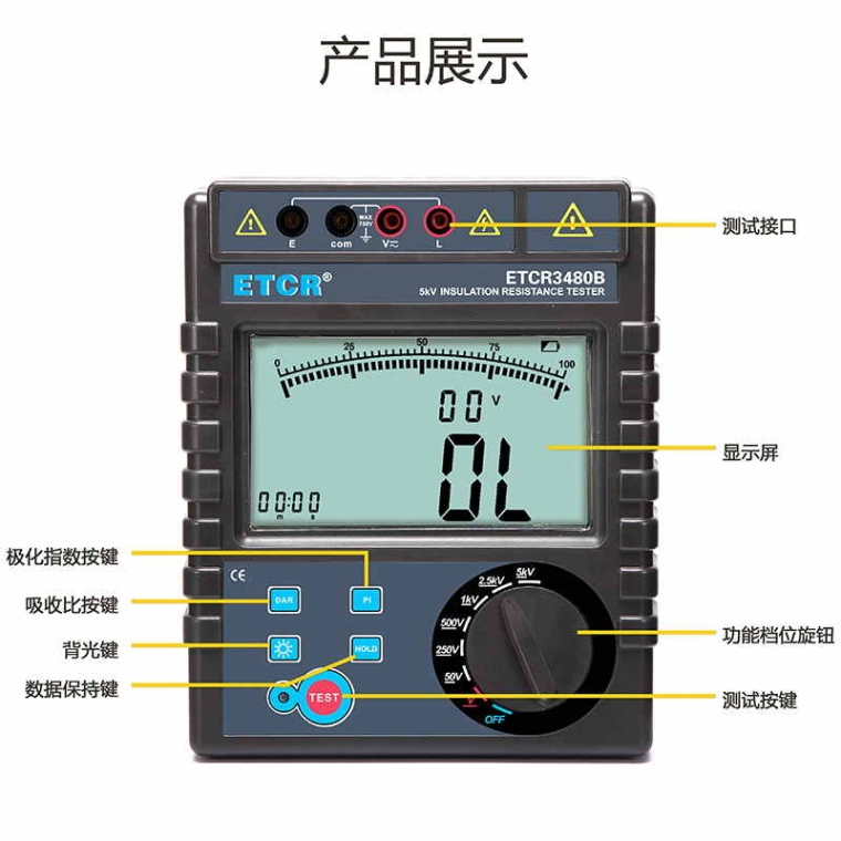 ETCR3480B绝缘电阻表又名兆欧表、绝缘电阻测试仪,用于绝缘电阻测试、吸收比、极化指数测试、交直流电压测试。仪表具有LCD大屏幕带背光显示、数据保持、自动放电、自动关机等功能。仪表具有测试计时,电压监测功能,回路电压大于36V时,仪表将禁止测试以保护被测物及人员**。仪表功能操作简易,绝缘电阻值,测试时间,输出电压同屏显示,具备交流电压、直流电压测试功能。
