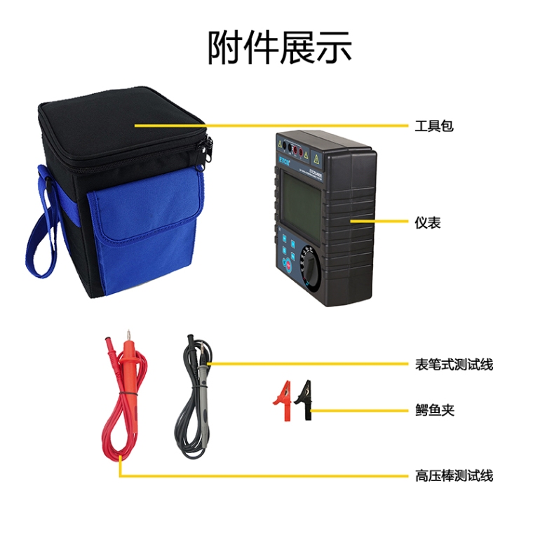 1. 6档输出电压50V、250V、500V、1000V、2500V、5000V,宽量程0.1MΩ~1000GΩ,*大短路电流2mA。