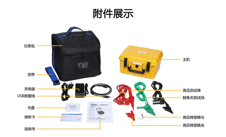 仪表采用大容量充电锂电池组。仪表的测试计时器自动记录测试时间、存储含有日期时间的测试结果,触摸屏可以非常方便的查阅记录的历史数据,完全隔离的USB接口可将测试数据**的上传到PC机。仪表配置带有双层绝缘及屏蔽层的测试线,高压棒配有可更换的鳄鱼夹及钩子,可适应各种测试场所。仪表采用坚固的双层外壳结构,仪表外箱防护等级IP65,能防止运输存储过程中水分灰尘的侵入及防止撞击有效保护仪表。