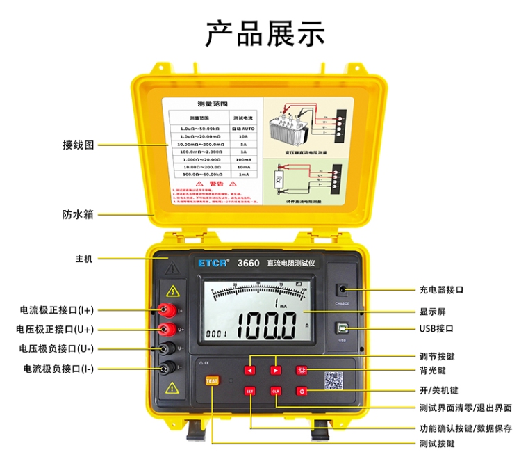 ETCR3660直流电阻测试仪又名变压器直流电阻测试仪、直流低值电阻测试仪、接地导通测试仪,仪表采用微处理机技术,精密四线法测试,准确可靠。主要用于测量变压器绕阻电阻;接地导通电阻;电缆导线电阻;开关、接插件、继电器的接触电阻;金属铆接电阻;线圈、电动机、互感器绕阻电阻;金属构件之间联结电阻;电焊接点电阻;蓄电池并联连接电阻;以及导线长度测量计算等。仪表外壳采用防水保护箱,防撞、防摔、防水(防护等级IP65)坚固安荃耐用,仪表还配有大容量可充电锂电池组,特别适合在户外工地使用。广泛应用于建筑质检站、监理公司、建筑施工单位、防雷公司、电力部门、船舶机车厂等。