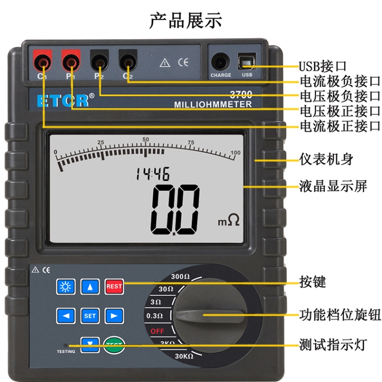 功 能 | 金属构件之间等电位联结电阻测试,低值电阻测试,直流电阻测试,地网地极间连接导体的电阻测试,接触电阻、铆接电阻测试、导线长度测试等 |