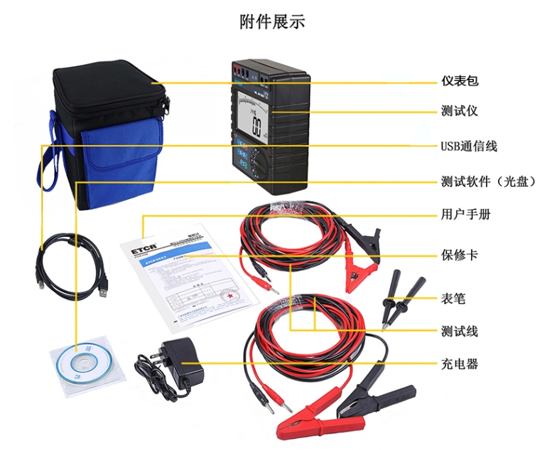 由主机、监控软件、测试线、充电器、USB通讯线等组成。主机超大LCD显示,带背光,棒图指示,一目了然,同时能存储400组数据。监控软件具有历史数据读取、查阅、保存、报表、打印等功能。