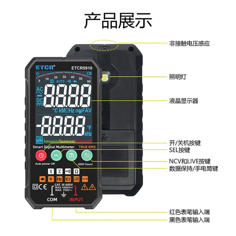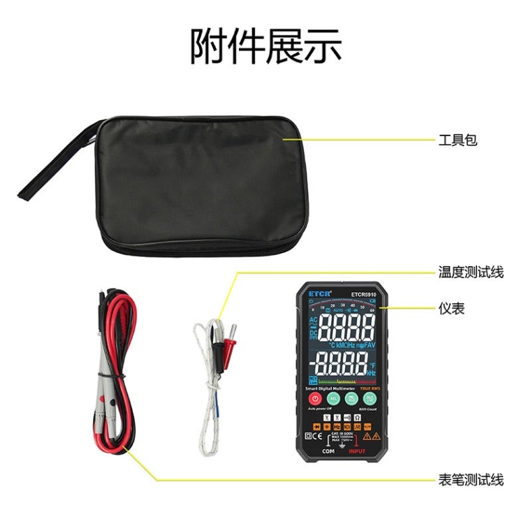 1. 便携式6000计数自动量程数字多用表,全新设计,结构精巧、操作容易、携带方便,是电工电子测量之理想工具。