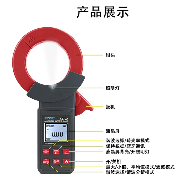 ETCR6670A钳形漏电流表用于线路交流漏电流测量、接地漏电流测量、电流测量、谐波测试等。