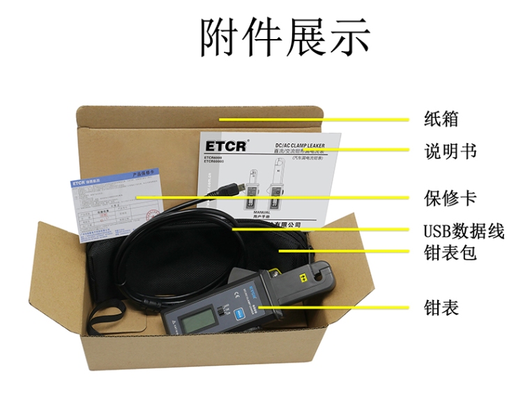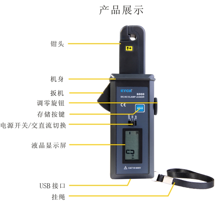 ETCR6000直流交流钳形漏电流表又名:直流漏电流钳表、汽车直流漏电流钳表、交直流钳形漏电流表。仪表具有数据保持、数据存储等功能,配备RS232接口、通讯线及软件,历史数据可以上传电脑,便于读取、保存、打印等。