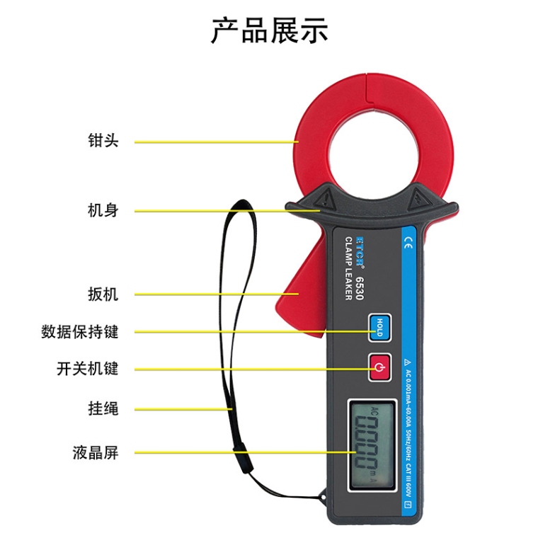 ETCR6530迷你型钳形漏电流表具有峰值保持、数据保持、数据存储等功能。