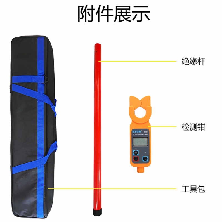 ETCR9100高低压钳形电流表连接绝缘杆,可用于69kV以下的高压线路漏电流测量,在线电流测量,判断氧化锌避雷器是否受潮或运行不好,仪表还具有峰值保持、数据保持、数据存储、无线传输等功能,其专用高压钳通过按压或退拔绝缘杆能方便钳夹或撤离被测导线,省时快捷,广泛应用于变电站﹑发电厂﹑工矿企业以及检测站﹑电工维修部门进行漏电检测和野外电工作业等。