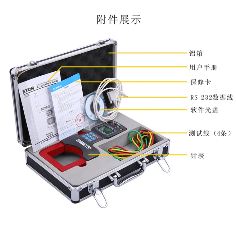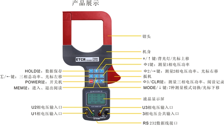 ETCR7300 | AC 0.00mA~1200A | 0.01mA | 可测量漏电流,有功功率、无功功率、视在功率等参数 |