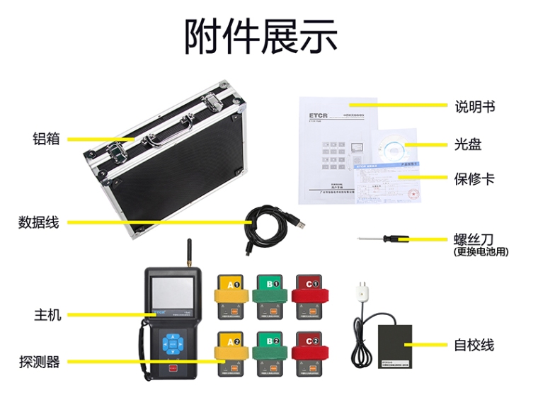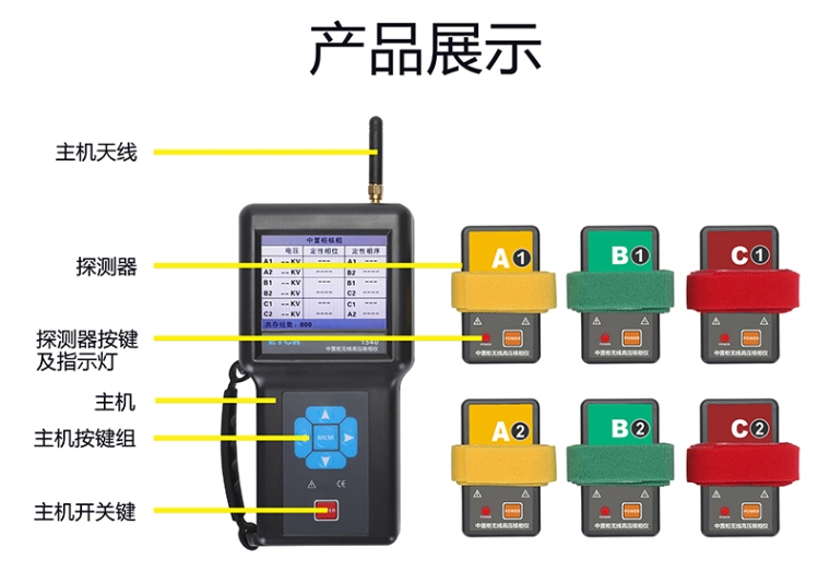 ETCR1540中置柜无线高压核相仪由主机、探测器组、监测软件、USB通讯线等组成,主机采用3.5寸真彩液晶屏,可以同屏显示相位、相序、核相结果及电压等级;同时三相显示,清晰直观,使测试更简单轻松。