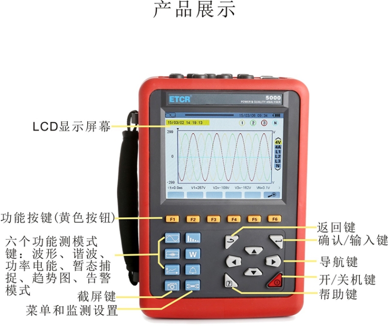 ETCR5000电能质量分析仪采用DSP+ARM双处理器架构,DSP负责数据的采集及算法处理,ARM负责通信协议及人机接口处理;模拟信号采集用2片ADI公司分辨率为16位的4通道同步采样的AD7655完成,实现zui高采样速率达到1MSPS,保证了通道的精度和信息完整性,保证了不错过电网中任何一个瞬态变化,使对瞬态波形、骤升骤降、瞬时中断等的侦测更加的精准;DSP工作频率达200MHz以上,能够及时监测电网并动态调整采样频率实现工频和采样频率同步;采用5.6寸LCD彩屏显示,分辨率为640dots×480dots,用不同颜色 区别显示各相的参数、波形图、相量图、谐波比图,使用户可以更高效更直观地了解电网参数状态。内置闪存可同时存储60组屏幕截图,150组瞬态电压/电流捕捉波形图,12800组告警日志,启动电流侦测模式可连续捕捉100s的启动电流波形。内置2G内存卡用于存储长时间趋势曲线记录,同时记录20个电量参数(可根据需要选择),5s采集记录一次,可记录存储长达300天的趋势曲线记录。
