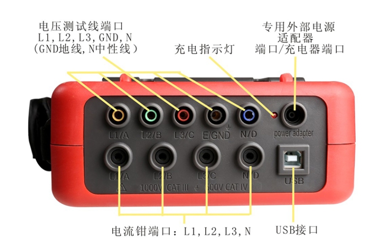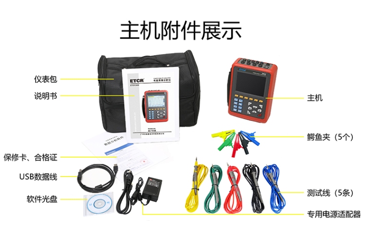 随机附件 | 主机:1台;仪器包:1个;测试线:5条(黄,绿,红,蓝,黑各1条);鳄鱼夹:5个;表笔:5个;充电器:1个;软件光盘:1个;锂电池组:1个;2G内存卡:1个;电流传感器(选购)。 |