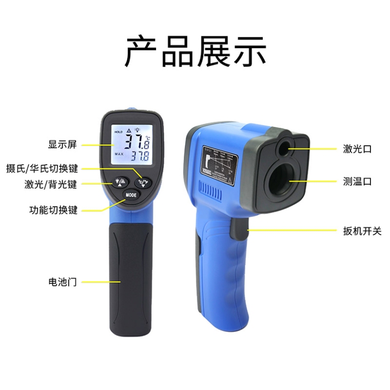 红外测温仪测量物体的表面温度,其光传感器辐射、反射并传输能量,然后能量由探头进行收集、聚焦,再由其它的电路将信息转化为读数显示在机上,本机配备的激光灯更有效对准被测物体及提高测量精度。