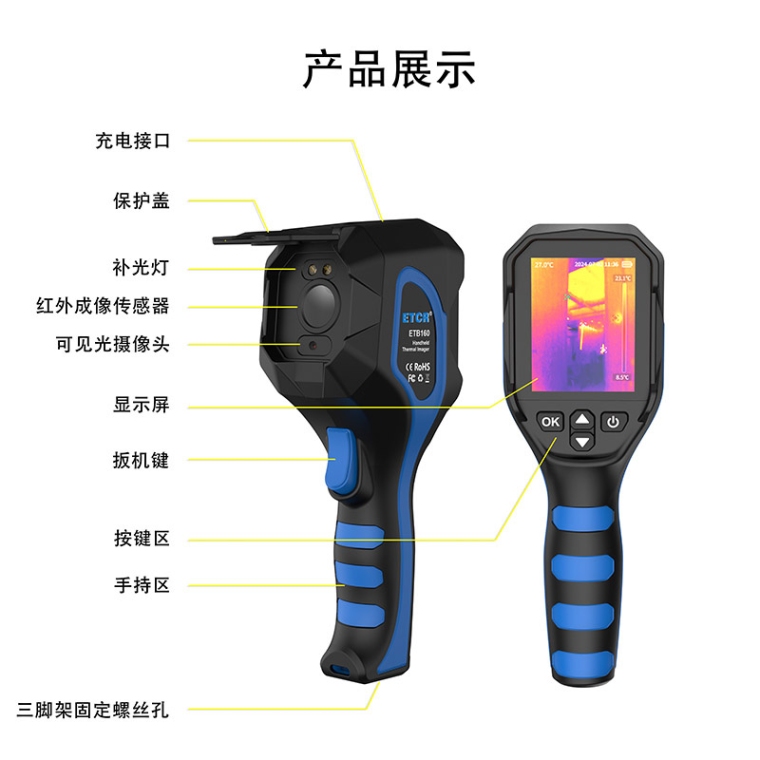 ETB160手持式红外热成像仪是一款手持式测温红外热成像仪,又称热成像仪、温度分析仪等,其分辨率为:162×120。是测温、成像一体的多用途热像仪;可进行实时观察图像、温度分析等功能,是电工和维修人员快速定位故障区域的理想选择。