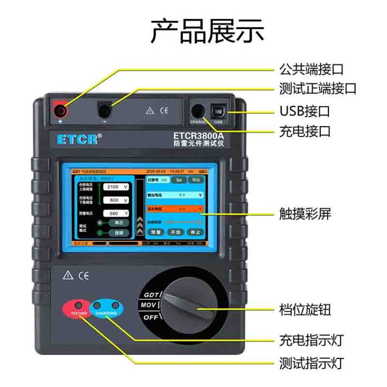 用于压敏电阻(MOV)、放电管(GDT)等防雷元件性能参数的测试及绝缘电阻(Mohm)、极化指数(PI)、吸收比(DAR)测试。