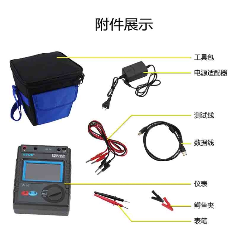 随机附件 | 主机:1件;测试线:2根;鳄鱼夹:2个;表笔:2个;电源适配器:1个;USB通讯线:1个; 工具包:1件 |