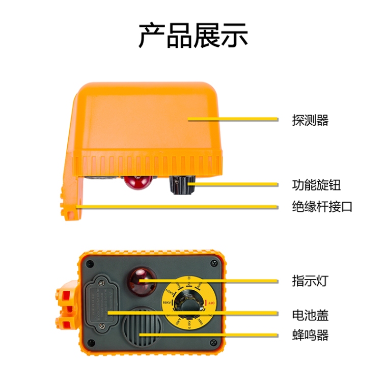是专为高压输电线路验电而精心设计制造。产品用于现场高压线路验电,识别高压系统电压等级,巡查高压线路故障,修理霓虹灯、高压钠灯检验感应电压,检验残留高压或感应电压等。产品由高压探测器与伸缩绝缘杆组成,采用非接触感应技术,无需接触带电体,保障了操作人员的**。验电器具有红色LED及蜂鸣器声光报警,辨识容易,9个电压档位涵盖了各种电压等级,适合各种高压系统,无需根据不同电压等级购置多套高压验电器,节省成本。防护等级达IP65,可在户内户外使用。验电器采用可调节接口与绝缘杆连接,连接可靠操作特别方便。