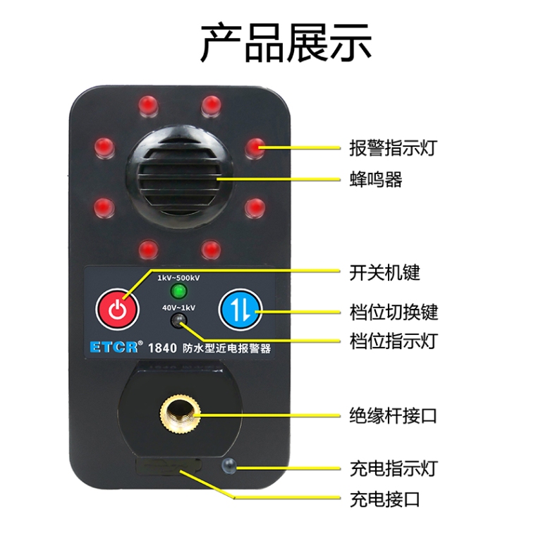 ETCR1840防水型近电报警器为电力作业人员提供一款安荃、实用、便捷的新型近电报警装置。报警器采用非接触感应技术,全方位感应空中的电场,当感应的电场大于阈值时,报警器触发报警功能发出声光及振动报警,提醒作业人员注意安荃,避免发生触电事故,为作业人员提供更加安荃的保障。