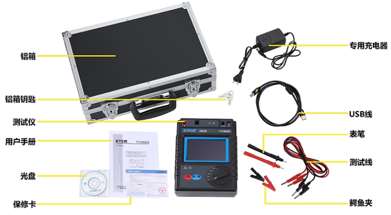 ETCR 3850瞬态抑制二极管测试仪也叫TVS测试仪是专门针对TVS二极管性能指标测试而设计的,属工业级测试仪器。由主机、LCD液晶显示屏、上位机软件、电源适配器等组成。瞬态抑制二极管和传统的稳压二极管相比具有更快的响应速度等优点,在电路设计中应用颇为广泛,因此为了保证产品的性能,对出厂的每只二极管性能进行测试显得尤为重要,在瞬态抑制二极管的性能指标中,其中*重要的指标就是“反向击穿电压”,本款产品就是针对这一指标检测而设计的。