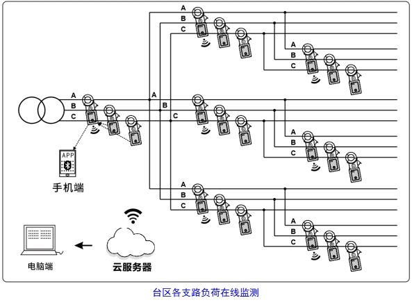 ETCR8080无线三相电流监测仪采用多连接通信技术,三个监测装置均内置蓝牙通信,其中A相监测装置内置4G通信,使用时将3个监测装置分别钳在负荷的A、B、C相上,通过监测装置采集负荷三相电流的实时数据,通过蓝牙汇总到其中具有4G通信功能的A相监测装置,A相监测装置将各相单位时间内的平均电流上传到后台服务器进行记录和分析。用户在现场可以通过手机蓝牙连接A相电流钳,将三相电流数据导入到手机,观察三相负荷电流数据及趋势,或通过后台远程查看监测仪记录的三相电流数据。
