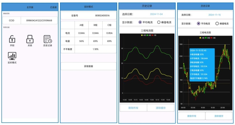 3.通过手机蓝牙在现场或通过4G通信在后台远程设置装置编号、测试间隔时间等,查看装置编号、电池电量、三相负荷数据。