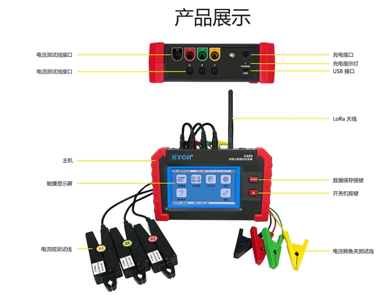 采用5寸触摸彩屏、中文界面、功能直达、自动测量、操作简易快捷,准确可靠,同时仪表采用大容量可充电锂电池、具有数据存储、数据查阅、自动关机、USB数据上传导出等功能。由于本仪器采用专用计量芯片,所以本仪表具备非常高精度的电参数测量,能够实时显示待测参数的变化,同时具备一键保存数据的功能。