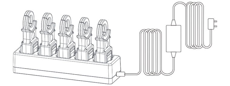 测试电流前需检查监测仪电量是否充满,以确保续航时间。充电时将监测仪插入本监测仪专用充电座内,接入本监测仪专用电源适配器。一个充电座可同时插入5个检测仪充电。充电充满时监测仪充电指示灯变绿色。