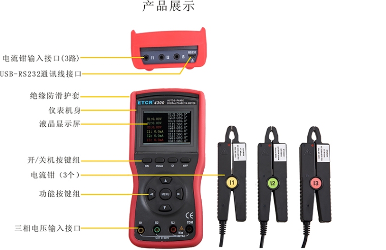 三相数字相位伏安表配有防振、防滑、高绝缘护套,采用2.8寸TFT彩色液晶屏,动态显示,向量图指示,一目了然,尽显精美豪华外观。其尖小形电流钳钳口适用于排线密集的地方。