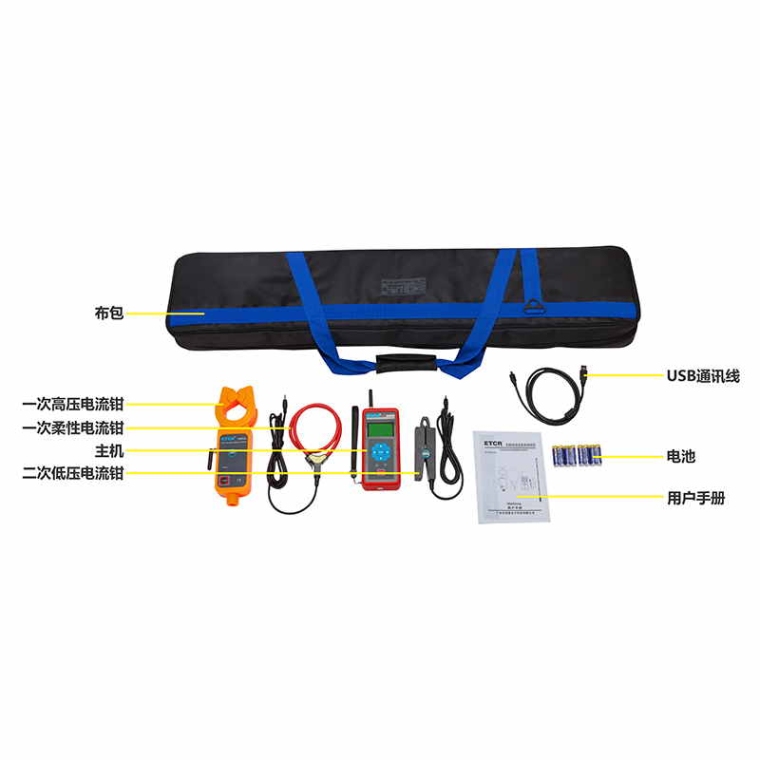 随机附件 | 主机:1件;一次高压电流钳:1件;一次柔性电流钳:1件;二次电流钳:1件; USB专用通讯线:1件;伸缩绝缘杆:1根;电池LR03:8个;工具包:1件 |