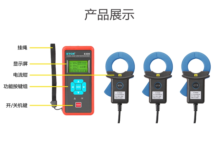 例如:ETCR8300-030X3,表示3路电流钳为030的钳形漏电流监控记录仪。