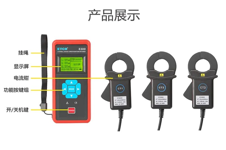 例如:ETCR8300-030X3,表示3路电流钳为030的钳形漏电流监控记录仪。