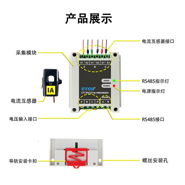 ETCR8320系列电力参数采集模块用于现场在线实时监测、记录3路交流电流、交流电压、无功功率、有功功率、视在功率、功率因数、畸变率、谐波、不平衡度、潮流方向等电力参数。应用于单相线路、三相四线线路。可广泛应用在电气装置的交流电流、接地环流、交流电压的在线监测,为用电检查人员提供安荃、准确、便捷的电力参数。