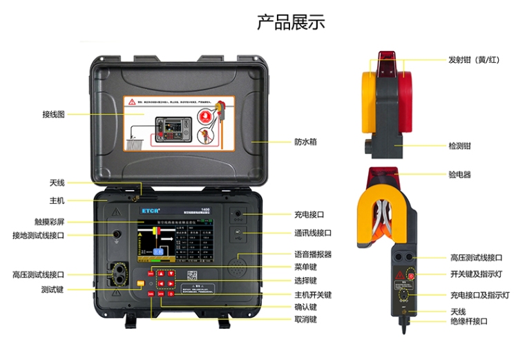 ,由主机、检测钳、测试线、接地针、绝缘杆及附件组成,主机与检测钳间采用无线通讯。主机采用7寸彩屏,故障指向清晰明了,测试结果一目了然,主机具有语音播报功能,语音提示线路故障方向,使得现场操作更加轻松。检测钳集信号发射、采集于一体,钳形结构,体积小,重量轻,挂装方便,一次挂装即可完成线路故障查找,操作简易快速,极大减轻了测试的工作强度,提高工作效率。检测钳自带非接触验电器,能检验电缆线是否带电,并发出声光报警,确保操作人员和设备的安荃。仪器还具有蓝牙通讯功能,下载APP后可在手机进行测试、查看测试结果、查阅历史记录。