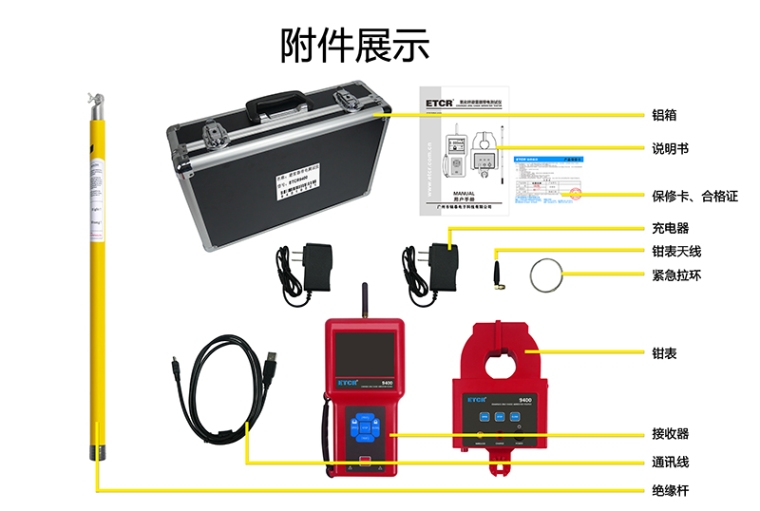 由主机、检测仪、绝缘杆组成。主机与检测仪采用无线通讯,通讯距离30米,主机可遥控检测仪钳头的张开或闭合完成测试过程,主机能实时显示电流测试值及钳头状况。检测仪采用微型马达驱动钳头的张开或闭合,钳头采用高性能坡莫合金制作,具有超强的抗干扰能力,分辨率高达1uA。检测仪可连接绝缘杆用于高压线路的绝缘子测试。仪表也可做高精度钳形电流表使用。