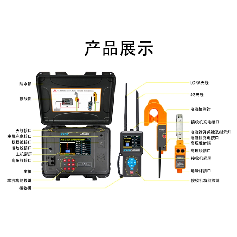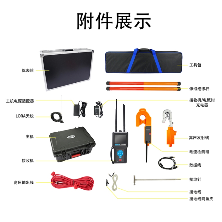 ,由主机、电流检测钳、高压发射端、接收机、测试线、接地针、绝缘杆及附件组成。主机与接收器之间为4G/LORA双模通信,控制高压信号输出,同时将测试结果发出到主机。电流钳与接收器之间为LORA通信,将电流钳检测到的信号发送到接收器。主机采用7寸彩屏,故障指向清晰明了,测试结果一目了然,接收机具有语音播报功能,测试结果、线路故障方向,使得现场操作更加轻松。电流检测钳及高压发射端结构紧凑,体积小,重量轻,挂装方便,一次挂装即可完成线路故障查找,操作简易快速,极大减轻了测试的工作强度,提高工作效率。