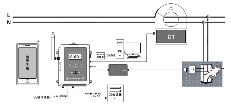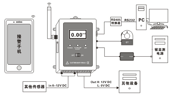 主机监控1路电流(LCD显示电流值)、1路外部电源通断状况(即供电电源的通断状况)、3路扩展输入接口(DC 0~12V模拟电压)、3路扩展输出控制接口(开/关:DC 12V/0V) ;提供1路RS485数据接口及MODBUS协议,便于二次开发;内置大容量可充锂电池,同时具有充电管理功能,当外部供电断开时,内置锂电池继续给主机供电工作,多方面实现远程监测、报警、控制等功能。