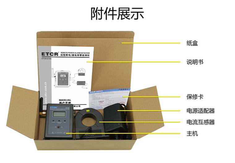 随机附件 | 主机:1件;CT传感器:1件;电源适配器12V/2A:1件;GSM天线:1件;软件光盘:1件 |