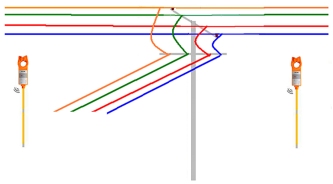 使用耦合钳在变压器的接地线或者漏电分支处注入特征信号 | 使用从机1在架空线分支处检测特征信号,判断是否漏电 |