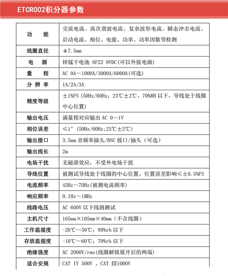 精度等级 | ±1%FS (50Hz/60Hz;23℃±2℃,70%RH以下,导线处于线圈中心位置) |