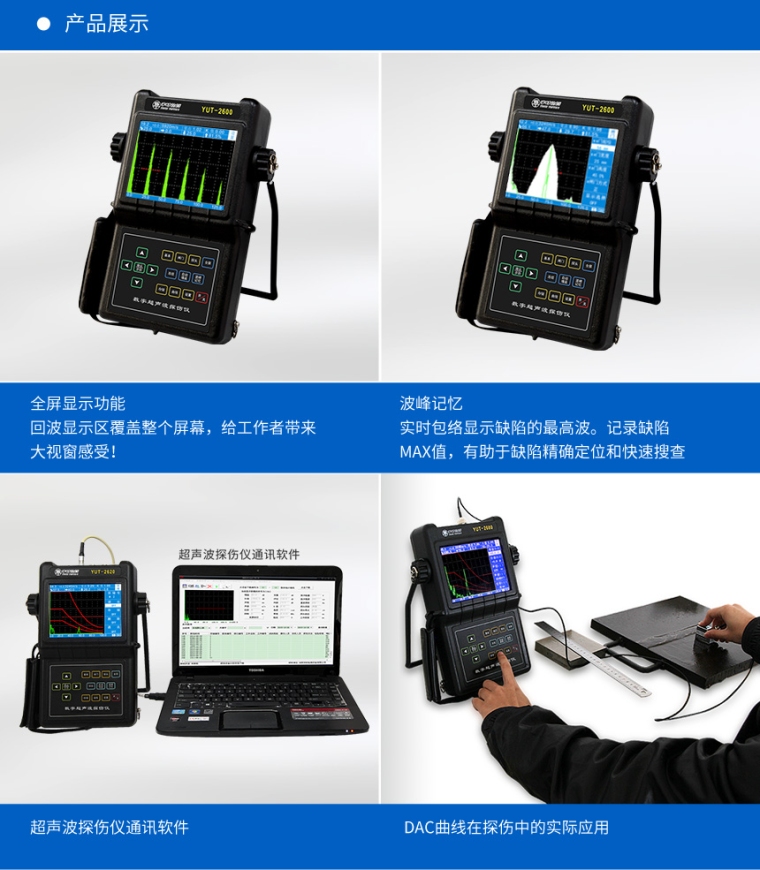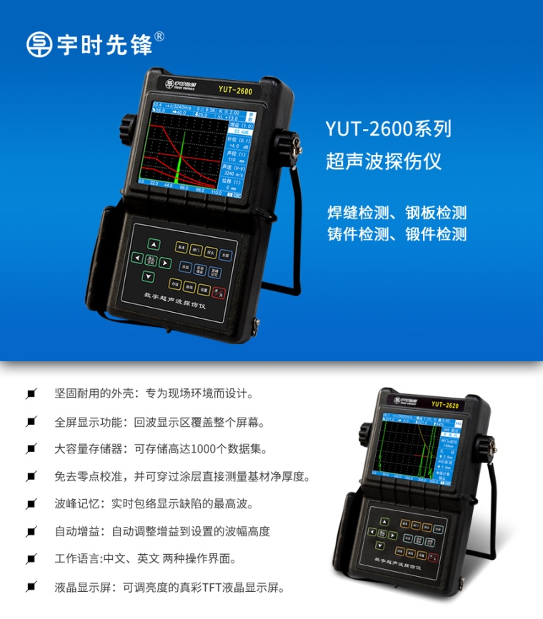 应用范围:YUT系列超声波探伤仪是一种便携式工业无损探伤仪器,它能够方便快捷、无损伤、准确地进行工件多种缺陷(裂纹、疏松、气孔、夹杂等)的检测、定位、评估和诊断。应用于电力、石化、锅炉压力容器、钢结构、** 、航空航天、铁路交通、汽车、机械等领域。