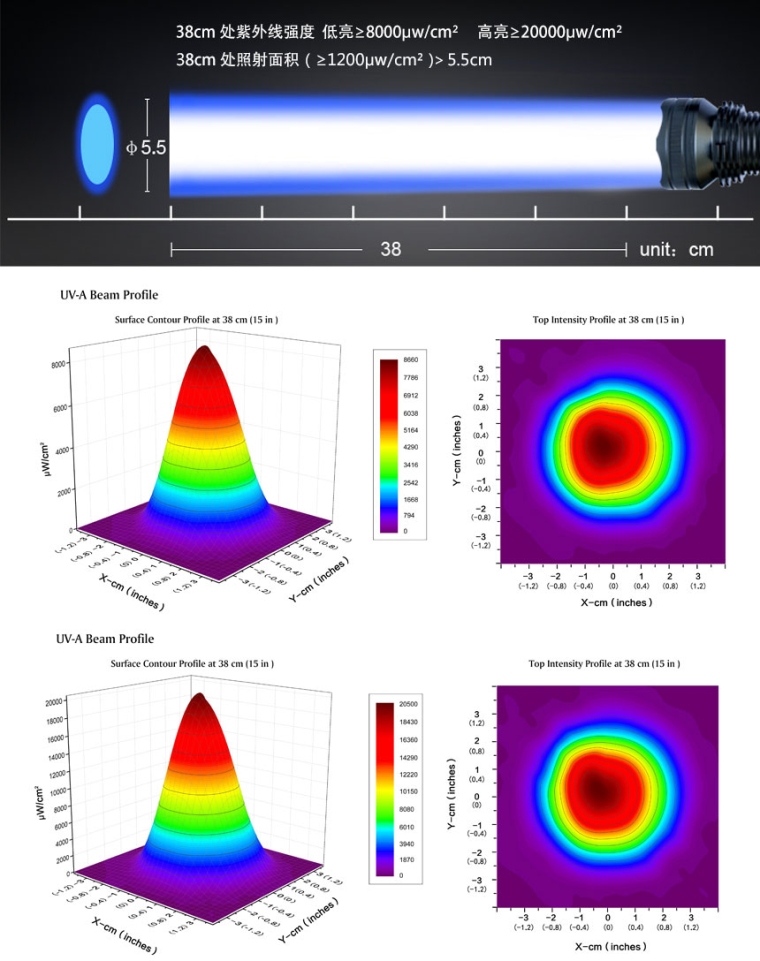 38cm处照射强度:低亮:8000 uW/ cm² ,高亮:20000 uW/ cm²