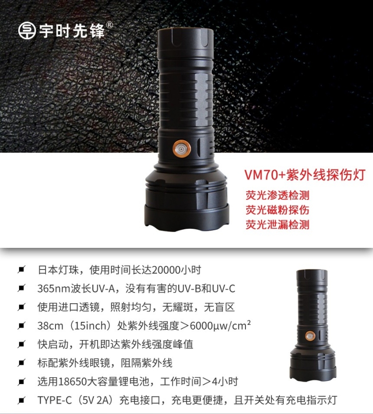 VM系列手电式LED紫外线灯是我公司研发的工业用便携式紫外线灯。全系产品具有高照度、工作时间长、质量稳定等特点。产品符合国家承压设备无损检测标准(NB/T 47013-2015)。