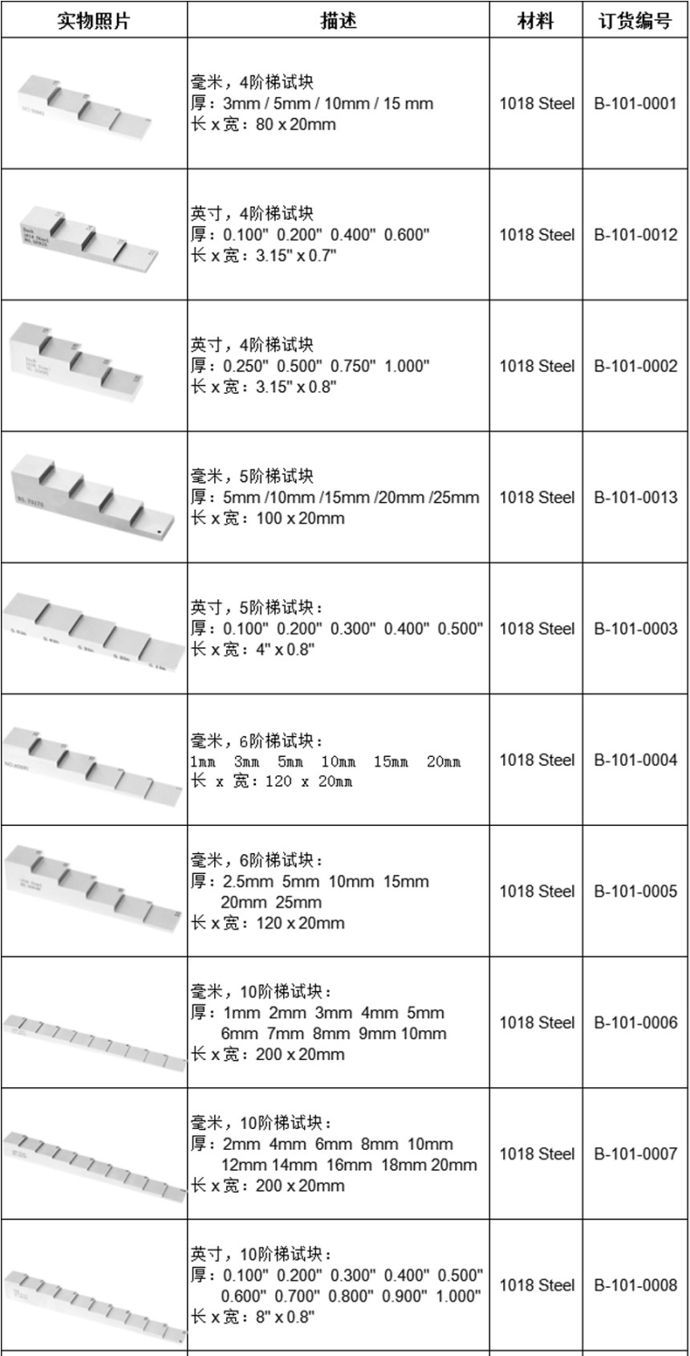 我司,专注于无损检测仪器的研发、生产、销售。可生产千余种规格型号的超声波探伤探头,超声波测厚探头,超声波测厚试块等配件。测厚试块执行GB/T 11344-2008无损检测接触式超声脉冲回波测厚方法。试块材质有:碳钢、不锈钢、铜、铝等。规格有:阶梯方形、阶梯半圆形、阶梯扇形等。厚度单位:毫米、英寸。同时还有多种外形美观的试块包装盒供您选择。如有其他规格需求可定制!