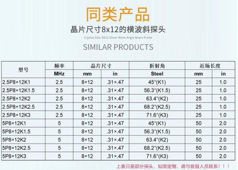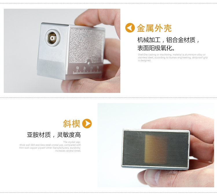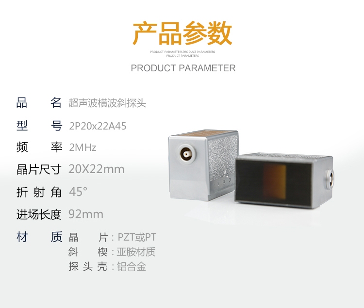 应用范围: 2MHz横波斜探头换能器应用在便携式超声波探伤仪,采用好的元件材料,使探头的灵敏度高使用时间长。
