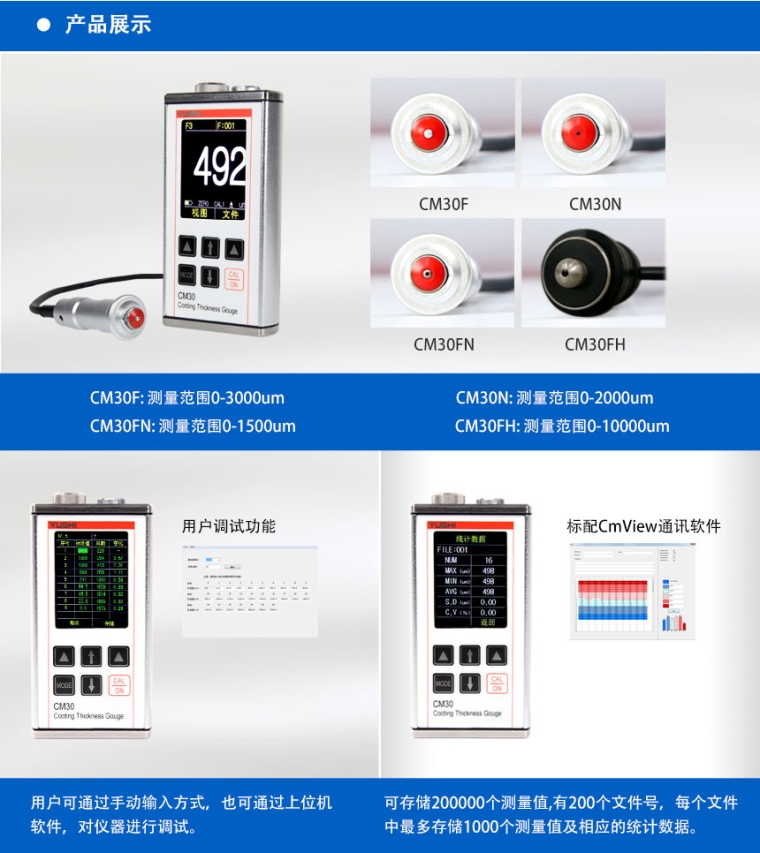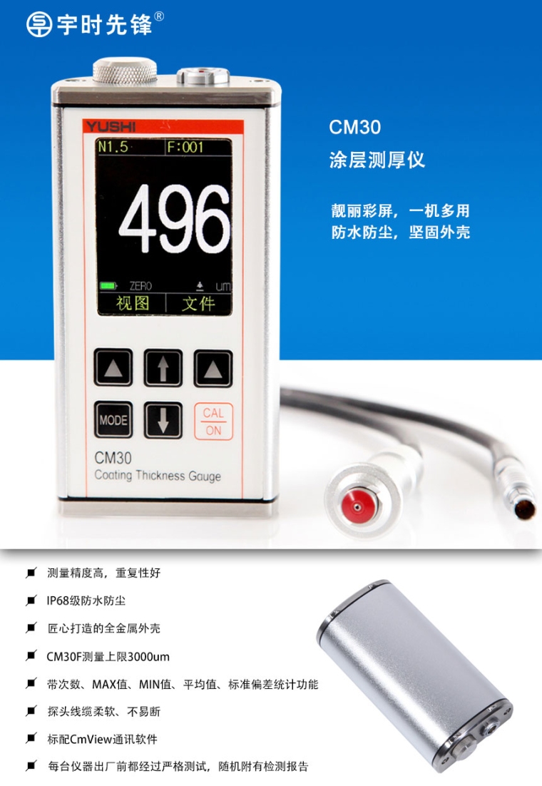 CM30系列涂层测厚仪是一种便携式的测量仪器,它设计用于无损伤的正确地进行涂、镀层厚度测量。既可以用于实验,也可以用于工程现场。