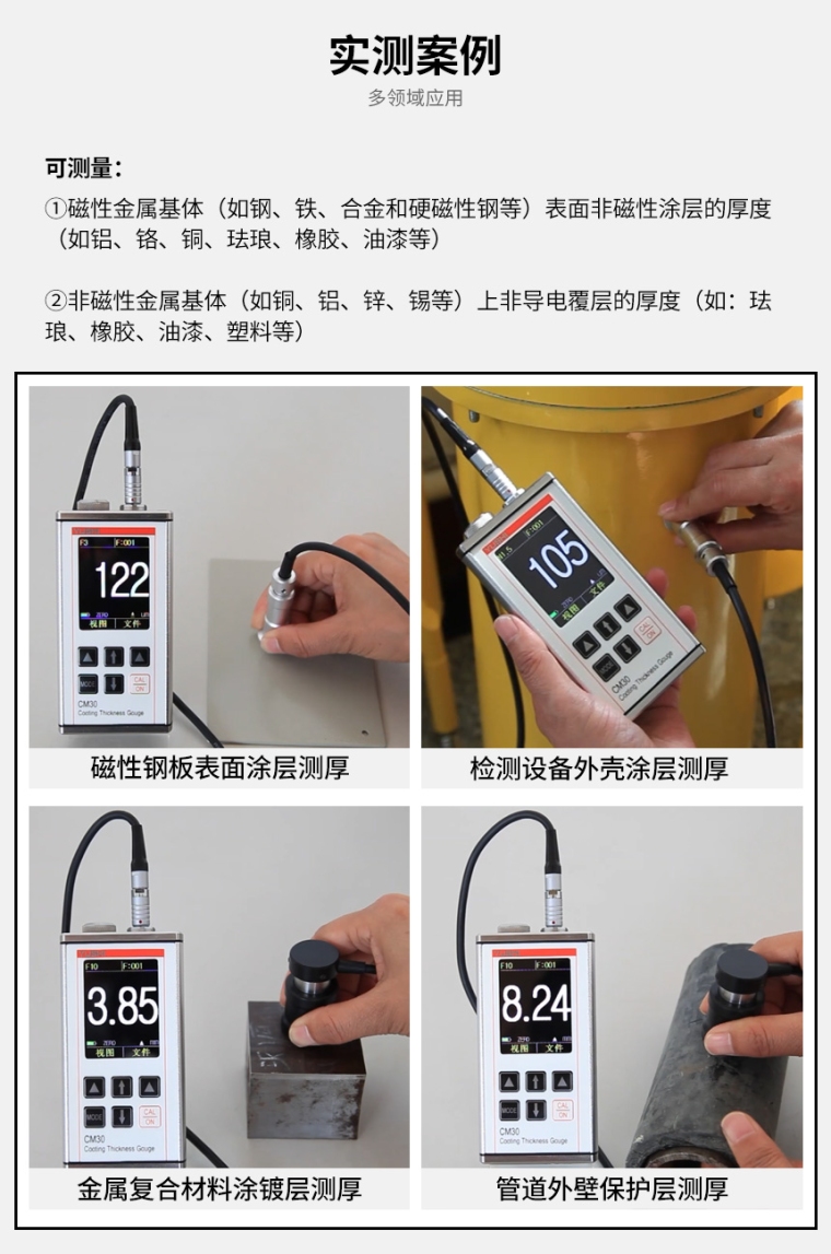 应用范围:应用于电子业、发电厂、石油化工、航空、建筑等领域。铁基体上的非磁性涂层(如油漆、清漆、搪瓷、镀铬和镀锌);或者有色金属上(如铜,铝,压铸锌,黄铜等)的绝缘涂层(如油漆、阳极氧化膜层或陶瓷)。等。