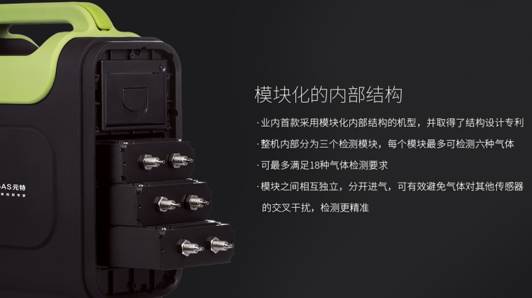 模块化结构: | 机体内部分为三个检测模块,每个模块最多可选配检测六种气体,一共可选配检测十八种气体,模块之间的独立性大程度上解决了气体之间相互干扰的难题 | |