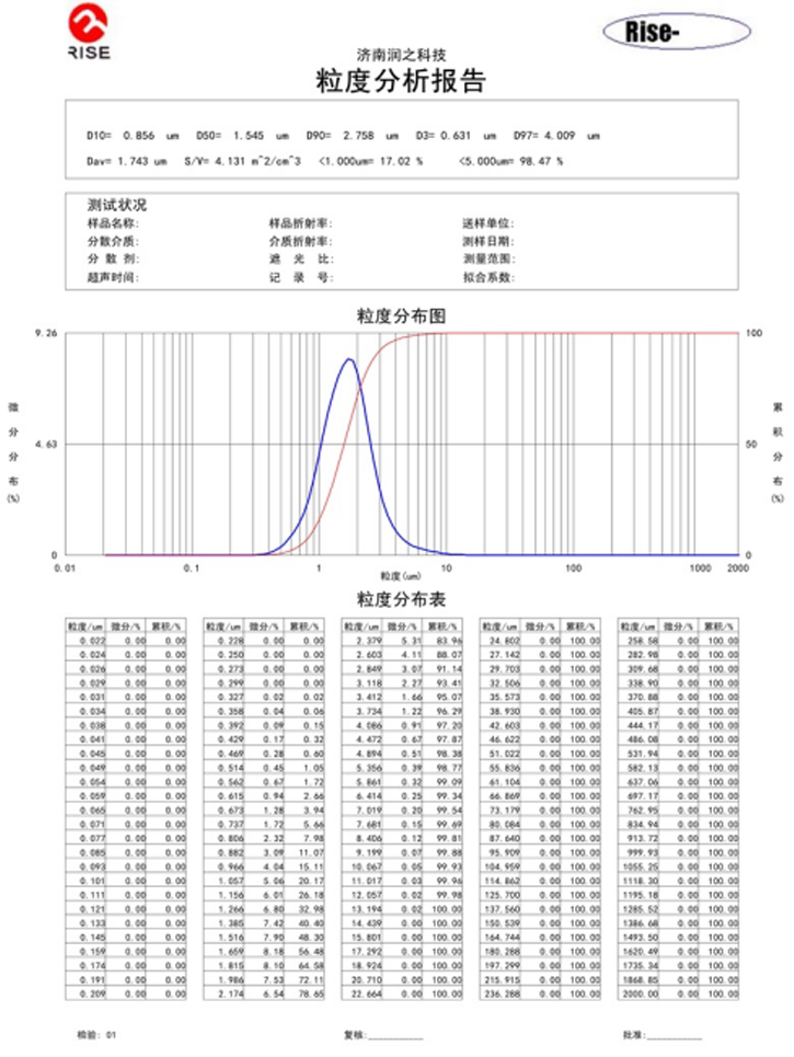 测试报告中有粒度分布图形和粒度数据图表,有D10、D50、D90、平均粒径和比表面积等特征参数,有四个自定义参数根据需要自行输入,重量比表面积与体积比表面积可以互换。粒度数据可保存到EXCEL。支持中、英文格式测试报告打印,页眉和页脚可根据需要进行修改,有打印预览功能,能够将粒度分布图形和粒度数据图表存成图片或PDF格式,便与WORD交互使用。