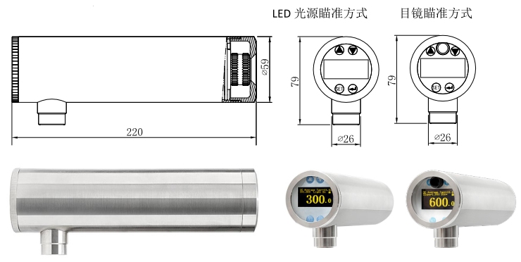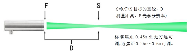 LED绿光源瞄准:采用可调焦镜头,光源的寿命长达10万小时。1:1指示出测量目标的大小。LED光源适用于近距离安装(如3m内)和非封闭环境中目标的检测。