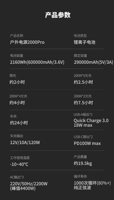 户外电源2000PRO大容量2200W/2160Wh便携式220V移动充电宝。